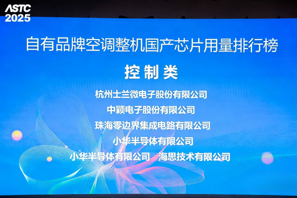 2025年12月10日,ASTC2025中国家电科技年会在湖北武汉举行。士兰微电子受邀参会,并在中国家用电器研究院发布的《自有品牌空调整机国产芯片用量排行榜》中,成功跻身国产芯片用量综合前五。尤为突出的是,公司在功率类芯片排名第一、控制类芯片排名第一、电源类芯片位列第三,全面彰显了在白电芯片领域的技术领先性与市场影响力。